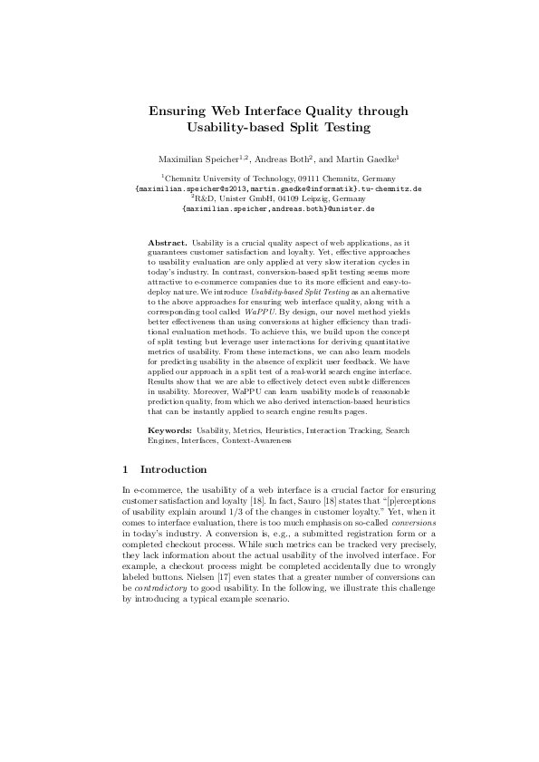 5 Maximilian Speicher, Andreas Both and Martin Gaedke (2014). “Ensuring Web Interface Quality through Usability-based Split Testing”. In Proc. ICWE.