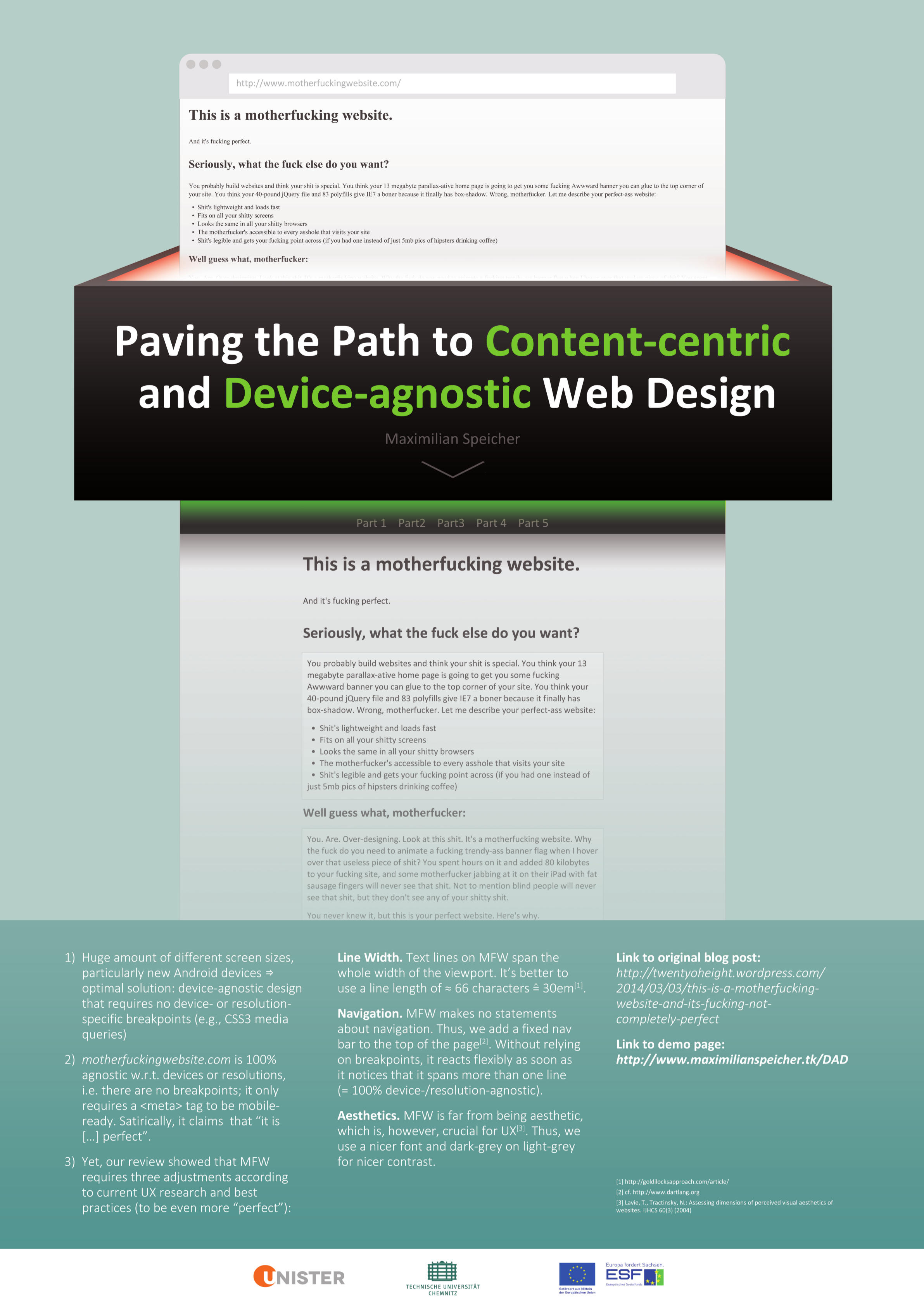 Device-agnostic design poster presented @ ICWE 2014From my original post about redesigning motherfuckingwebsite.com (see here), I have created a poster along with a corresponding short paper, which have been presented at the 2014 International Conference on Web Engineering (ICWE).