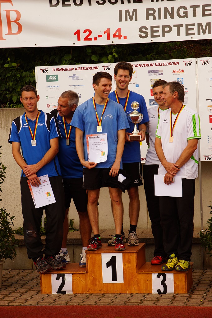 Finally, on the third day, the competition in free-style doubles took place. Again, I played together with Alexej. We lost the first match of the group stage against the defending champions Christian Herzog & Fabian Ziegler, but still managed to make it to the quarter-finals after securing the second place in our group. After winning against Thomas Tregel & Julian Sauck, in the semi-final we faced Rainer & Timo Hufnagel—who have been 7-time German champions in free-style doubles and to whom I lost the 2010 and 2011 finals after extra time. In a very tight match that Alexej and I controlled all of the time, we were able to secure a one-point advantage in the end. Although this might sound close, it was a deserving win, as we were ahead of our opponents during the whole course of the match. So, we proceeded to the final (for the third time in four years), where we faced Thomas Bleile and Jürgen Öttel (head and assistant coaches of the national team), who rather surprisingly won against Christian & Fabian. In a very tense match that was characterized by a very defensive and temporizing style of play, Alexej and I were in front 3–2 at half time. Scores in free-style doubles are very much lower compared to alternating doubles, as each player has only half a court to cover. Thus, it is very much harder to score active points and unforced errors are multiply painful, which enforces a rather defensive course of the game. Although this might sound more boring, it makes the discipline even more exhausting and mentally demanding, because a single error can be match-winning for the opponent. In the second half, which was even more tense than the first one, Thomas & Jürgen managed to equalize (6–6) two minutes before the end. However, this time good fortune was with Alexej and me and after a direct point and two unforced errors by our opponents, we won with a score of 9–7.